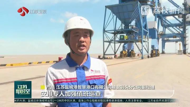江蘇鹽城港智慧港口有限公司糧食碼頭分公司副經理嚴浩說:“安排專人加強值班巡查,全方位、不間斷地排查隱患,確保各項防護措施萬無一失?!?/p>