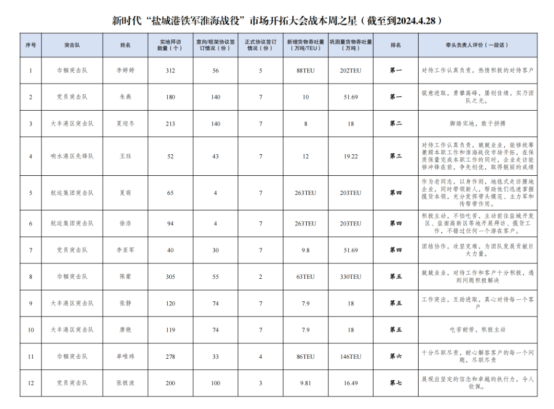 第一名:巾幗突擊隊(duì) 李婷婷(拜訪客戶312家,簽訂意向協(xié)議56份,簽訂正式協(xié)議5份,新增貨物吞吐量88TEU,鞏固量貨物吞吐量202TEU);黨員突擊隊(duì) 朱燕(拜訪客戶180家,簽訂意向協(xié)議140份,簽訂正式協(xié)議7份,新增貨物吞吐量10萬(wàn)噸,鞏固量貨物吞吐量51.69萬(wàn)噸)